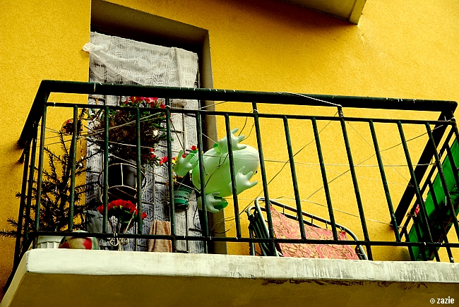 na bielanach mieszkają naprawdę dziwnie ludzie. na jednym z balkonów pląsała sobie w najlepsze nadmuchiwana żaba.