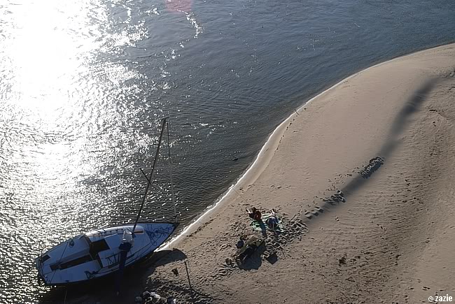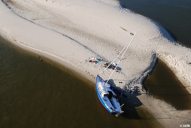 bezludna wyspa na wiśle. na kocyku – robinson crusoe i piętaszek. tuż obok na karimacie – daniel defoe.