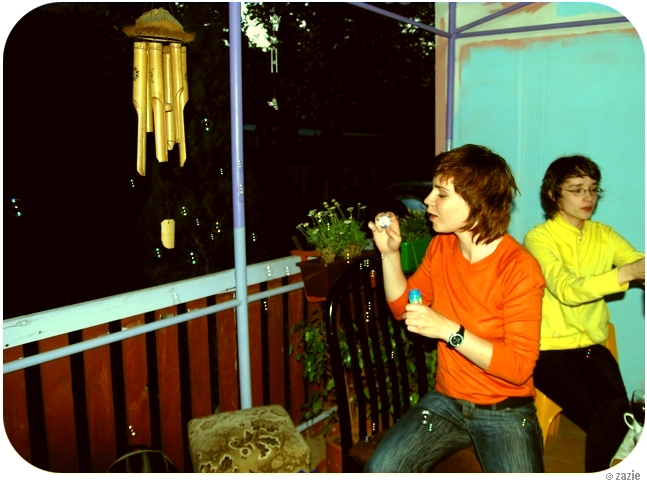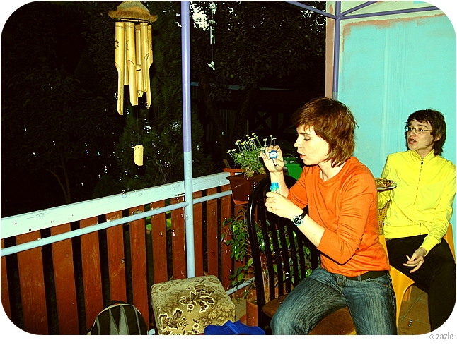 krystyna pokazuje koleżankom jak mydlane bańki układaja się we wzór haftu richelieu