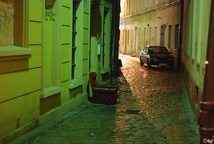 po mokrym bruku w jesienną noc.