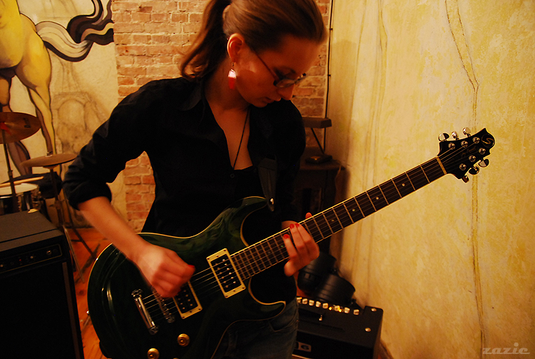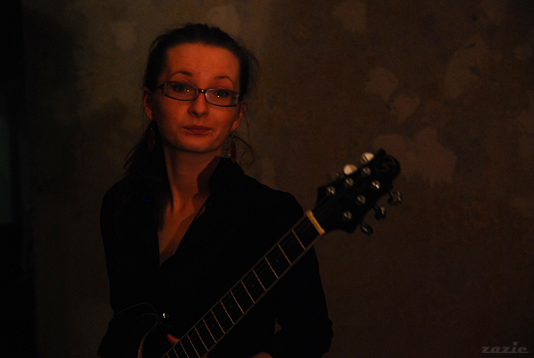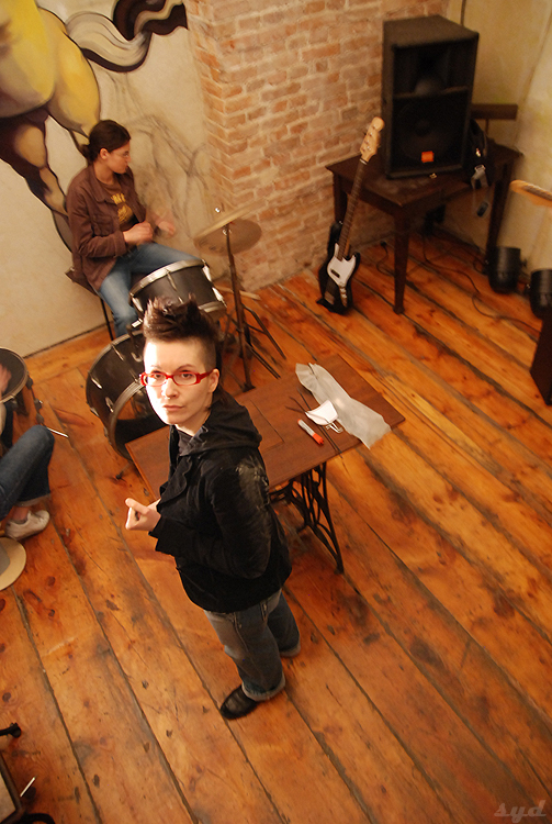 Miszczyni cwiczy riffy piosenki biesiadnej i chabrów z poligonu. w tle murmurando reszty zespołu.