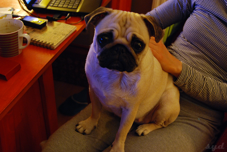 i zwinięty w krewetkę mały gruby pies śpiący na kolanach,