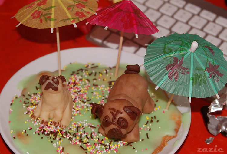 marcepanowy mops ulepiony przez Syd oraz marcepanowa świnia udająca mopsa wykonana przez Zaz