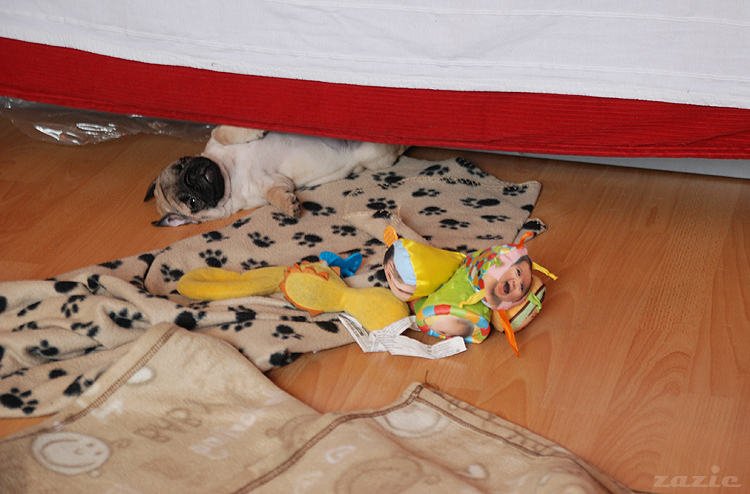z czeluści zabezpieczonej folią (na wypadek gwałtownego osikania) sofy wypadło na podłogę mopsie niemowlę