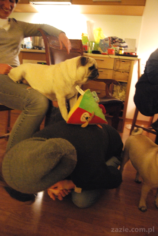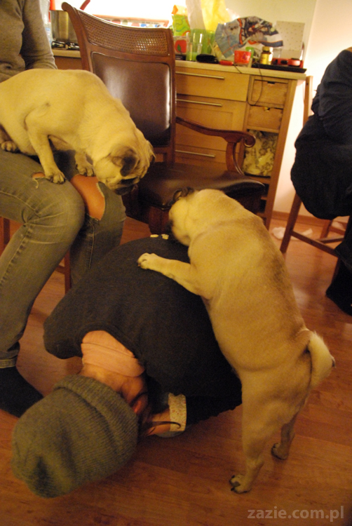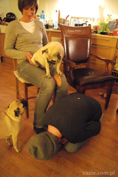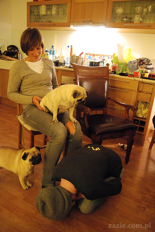 no dobra, a teraz czas na pokutę. mopsik chce zejśc z kolan cioci, ale mu za wysoko.