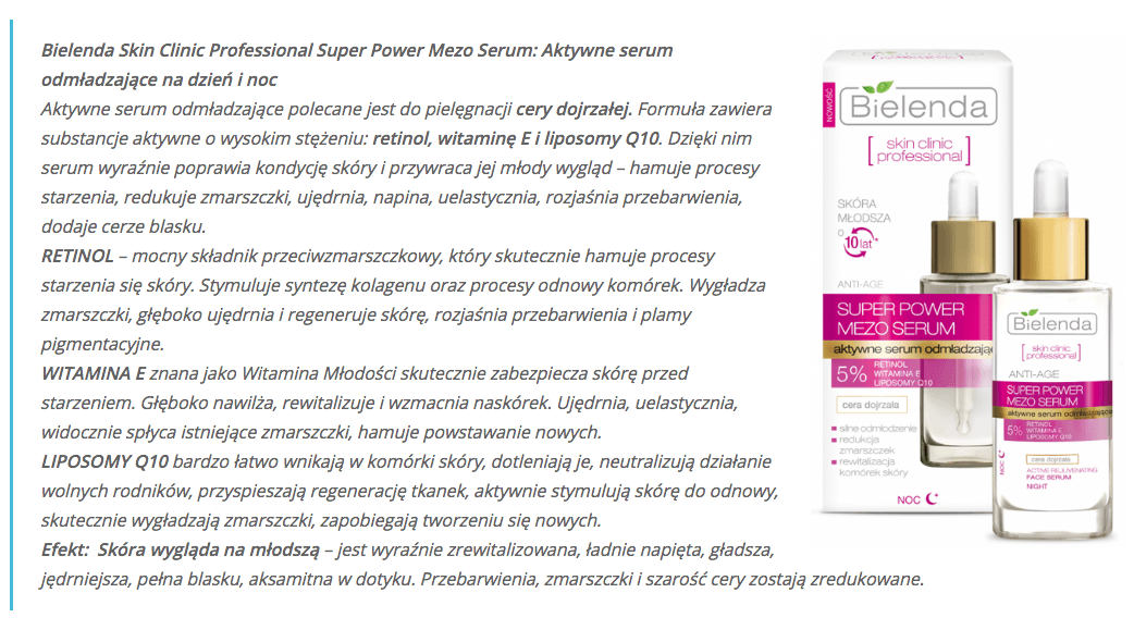 Patrząc na stan mojej skóry, muszę stwierdzić, że daleko mi jeszcze do półki z kosmetykami anti-aging, ale nie byłabym sobą, gdybym nie sięgnęła po kolejne serum Bielendy. A że Super Power Mezo: Aktywne Serum Odmładzające z retinolem przeznaczone jest do skóry dojrzałej, potrzebującej ujędrnienia i odżywienia… Eeetam, i tak się posmaruję!