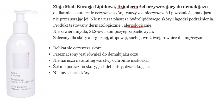 Aktualnie męczę moją twarz Atredermem, więc pomyślałam, że oprócz nawilżania i łagodzenia podrażnień, przydałoby mi się coś naprawdę łagodnego do mycia. Jeśli mam być szczera, to nie jestem entuzjastką delikatnego oczyszczania, bo uważam, że większość problemów skórnych na twarzy bierze się właśnie z niedokładnego i powierzchownego usuwania zanieczyszczeń, sebum zalegającego w porach i martwego naskórka. No ale kuracja retinoidem na alkoholu rządzi się innymi prawami, więc zdecydowałam się na mycie buzi preparatem dla atopików: Ziaja Med, Kuracja lipidowa – Fizjoderm żel do mycia skóry atopowej