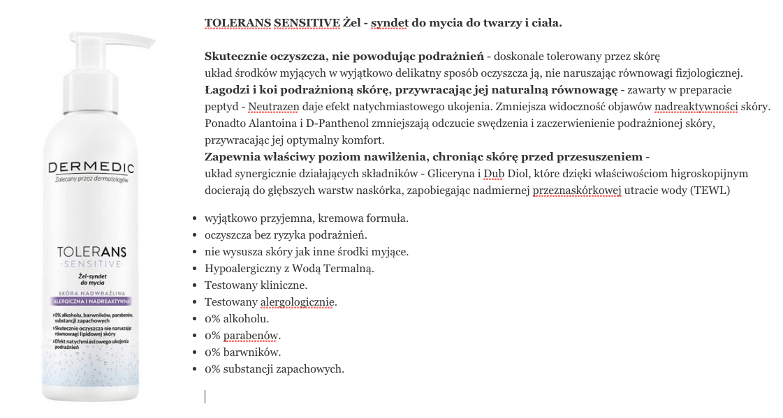 Zwłaszcza, że w żelu Dermedic Tolerans Sensitive jest sporo fajnych składników przeciwzapalnych i kojących – np. Dextran Sulfate, Palmitoyl Tripeptide-8 oraz pantenol i alantoina. Nie wiem, ja nie jestem chemikiem, nie znam się, ale: po co psuć fajną bazę na bazie detergentu z dodatkiem dobrych łagodzących składników aktywnych – kilkoma naprawdę niefajnymi substancjami? Jasne, że można powiedzieć: „najważniejsze, że działa”. Pytanie, za jaką cenę. Bo jeśli ktoś upodoba sobie ten kosmetyk i będzie się nim mył dzień w dzień, całymi latami, to nie wierze, że pozostanie to bez wpływu na jego skórę.