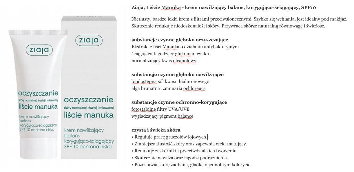 Po raz kolejny postanowiłam się „przymierzyć” do ochrony przeciwsłonecznej 2w1 czyli zestawu filtrów SPF w codziennym kremie pielęgnacyjnym. Przy okazji zakupów w aptece, zgarnęłam krem nawilżający balans, korygująco-ściągający, SPF10 Ziai z serii Liście Manuka. Byłam ciekawa, jak tym razem Ziaja poradzi sobie z kosmetykiem dla cer tłustych i problematycznych, bo jak dotąd kosmetolodzy/chemicy pracujący dla tej marki wydają się kompletnie nie kumać bazy, o co chodzi w pielęgnacji cery trądzikowej :D
