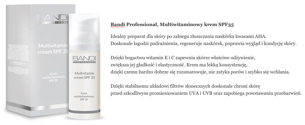 Coraz częściej mam wrażenie, że przyczyną wszystkich moich wtop i rozczarowań kosmetycznych jest albo jakiś przedziwny defekt mojej skóry, albo jakieś błędnę założenia, które przyjmuję, podczas wybierania kosmetyków, które kupuję. No bo tak: Bandi Professional, Multiwitaminowy krem z filtrem SPF35 – idealny po zabiegu złuszczania skóry kwasem AHA. No przecież opis jak na mnie skrojony!