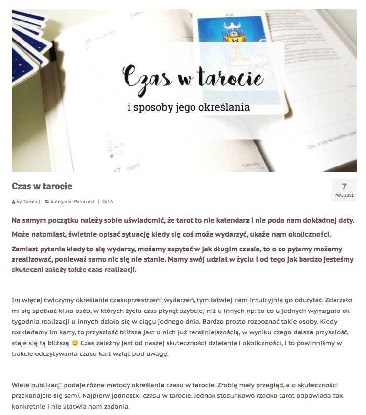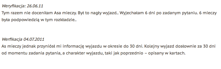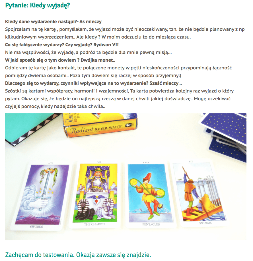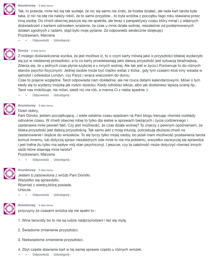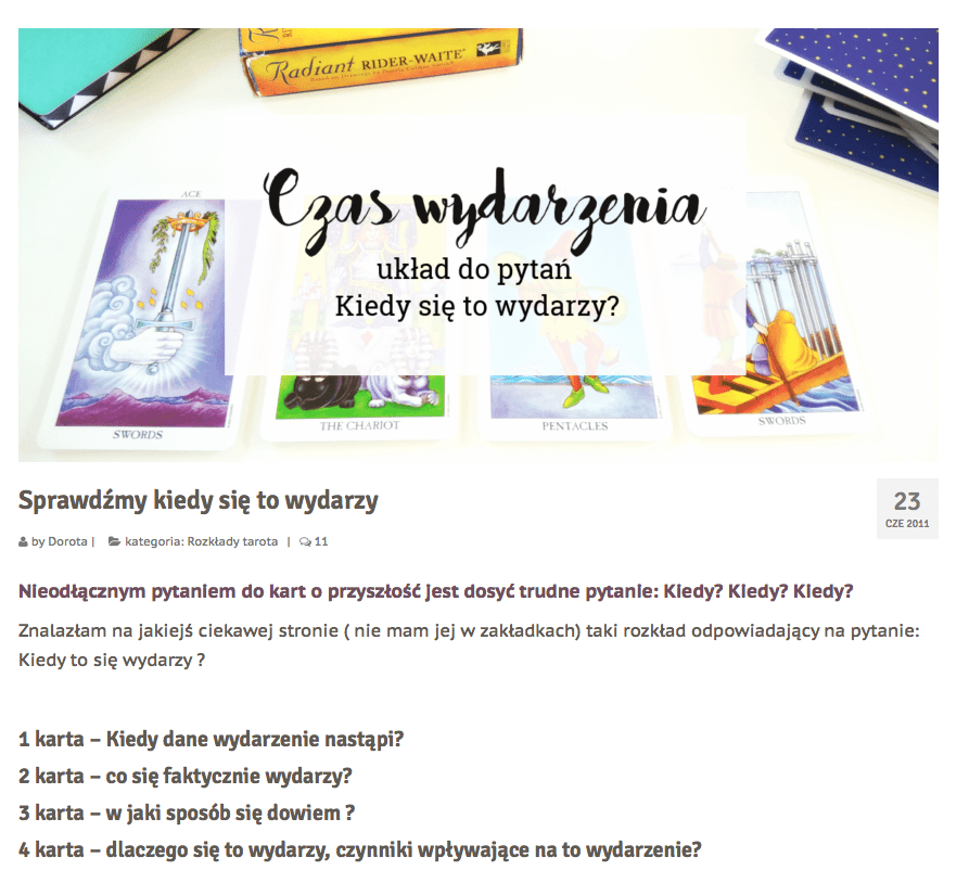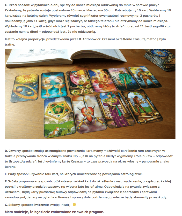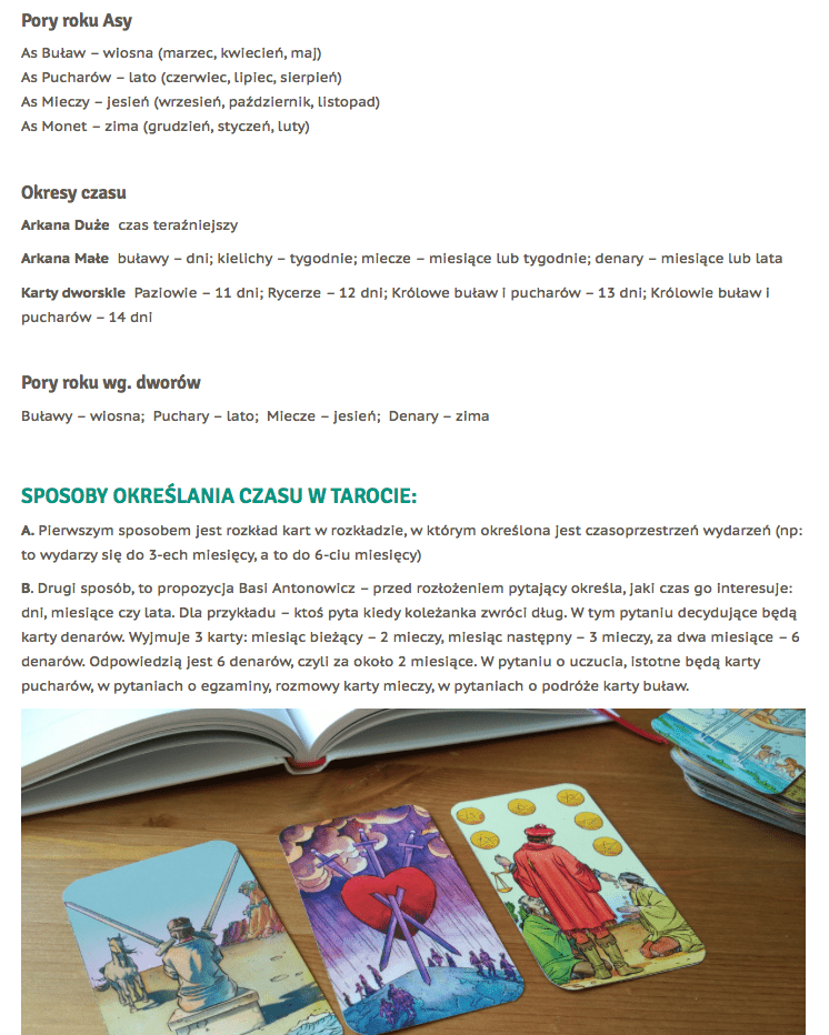 Każdy tarocista ma swoją, wypracowaną przez lata metodę określania czasu nadchodzących wydarzeń. Nie oznacza to, że jedna jest lepsza a inna gorsza, to od nas zależy jak „umawiamy” się z kartami. Czasami lepiej jest zastosować osobny, krótki i konkretny rozkład, który odpowie nam na pytanie w jakim czasie się dana sprawa wyklaruje. Szczególnie jeśli jeszcze zadamy dobrze sprecyzowane pytanie na dany okres czasu.