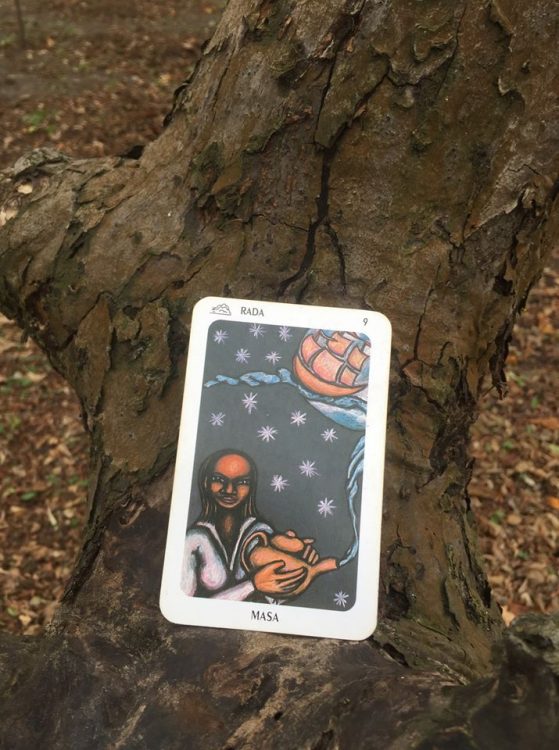 W talii THE NEW ORLEANS VOODOO TAROT, z której właśnie skorzystałem, dziewiątka mieczy jest poświęcona Masa, grupie loa (wuduistycznych bóstw/duchów), których zadaniem jest transportowanie wody pomiędzy innymi loa. Obrazek przedstawia żeńską Masa trzymającą czajnik. Z naczynia unoszą się opary, które łączą owo naczynie, czyli – jak czytamy w towarzyszącej talii książce – Ziemię, z gwiazdami i w których pływa statek Agwé, loa mórz. Pojawienie się tego ducha-transportera – na karcie należącej do powietrznych, intelektualnych mieczy – zachęca np. do wprowadzenia elementów jednego projektu do innego projektu, do znajdowania punktów wspólnych między różnymi systemami światopoglądowymi czy paradygmatami, do łączenia informacji z różnych dziedzin i źródeł, do przekazywania informacji, do otwartości na informacje przychodzące z niespodziewanych miejsc, do tworzenia kompleksowych, usieciowionych struktur.
