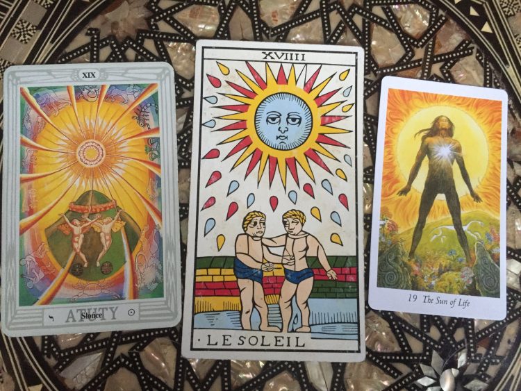 Tarotowa tradycja mówi nam, że w LE SOLEIL dziecko, które widzi, pożycza swoje oczy dziecku niewidomemu. To piękna metafora tego rodzaju komunii, jaki sugerują litery OEI. Może musimy pożyczyć oczy od kogoś innego, żeby być prawdziwie kompletnymi. Być może wtedy uświadomimy sobie, że jedyna tajemnica, którą można odkryć poprzez wynajdywanie ukrytych wskazówek i połączeń w świecie dookoła nas, to tajemnica nas samych.”