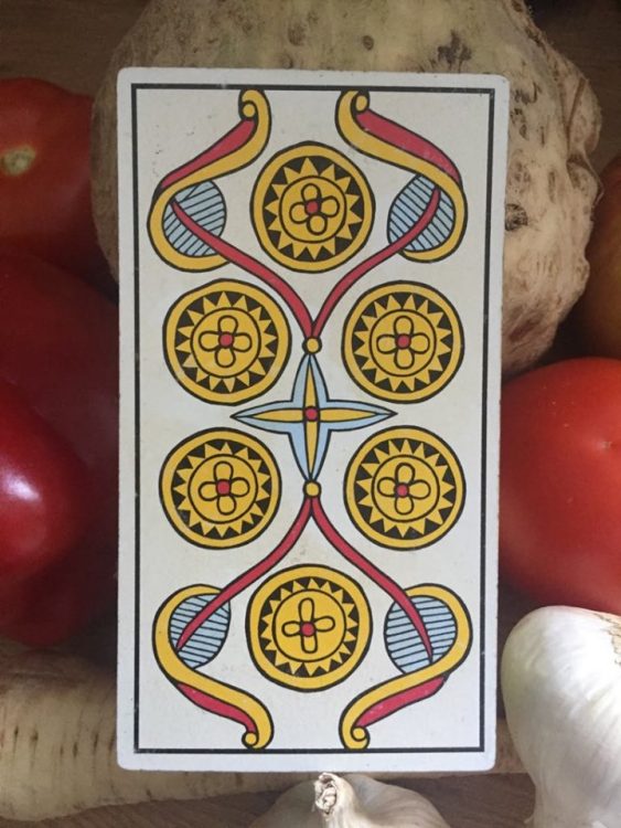 Poza tym w literaturze tarotowej często pojawia się znaczenie 'równowaga dawania i brania’, będące efektem kontaminacji Waite’owskiej (’dar’) i złotobrzaskowej (’materialna równowaga’) interpretacji tej karty.