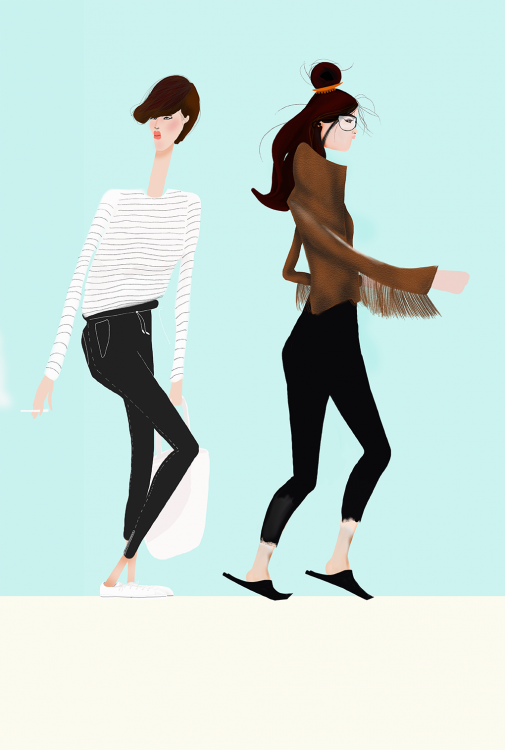 Pamiętam, że wtedy pokazałam kilka z tych „wymarzonych ciuchów” mojej ówczesnej Czytelniczce, z którą korespondowałam – super uzdolnionej graficzce Joannie Dydyńskiej (patrzcie: dyskadesign.pl oraz behance.net), a ona w ramach niespodzianki narysowała i zaanimowała mnie z kijkami nordic walking (oraz z moją ukochaną „cygańską” spinką do włosów zwaną „oktopusią”) w jednej z tych kreacji…