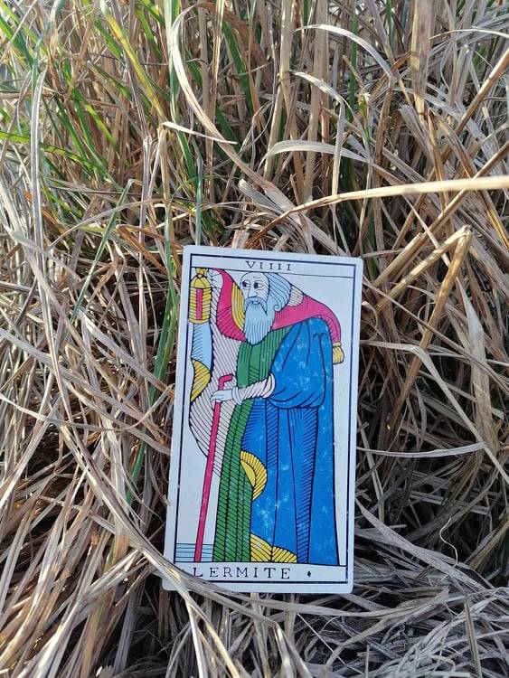 „Kiedy stoimy jako odbicie LERMITE, z lampą w lewej ręce i laską w prawej, stajemy się literą L rozpoczynającą to słowo. Światło latarni przed nami pokazuje nam, skąd przychodzimy. Wiemy, czego doświadczyliśmy. Za nami światło latarni rzuca nasz własny cień, ukrywając przyszłość. Czy widzisz, że – tak jak litera L jest literą I rzucającą swój cień na ziemię – za LERMITE niczego nie ma? Karta ukazuje jasną, żółtą ścieżkę przed nim, ale pustą przestrzeń za nim. To sugeruje, że LERMITE idzie tyłem, zachęcając nas, byśmy zaufali, że zawsze będzie jakaś droga, nawet jeśli światło rozumu jeszcze jej nie odkryło.