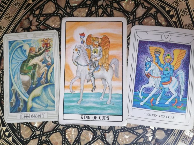Jego magiczne tytuły to Pan Fal i Wód, Król Morskich Zastępów oraz Król Ondyn i Nimf (stąd w części talii utrzymanych w tradycji Złotego Brzasku, takich jak „The Golden Dawn Tarot” Regardiego i Wanga czy „The Golden Dawn Magical Tarot” małżonków Cicero, figuruje nie jako „rycerz”, tylko jako „król kielichów”, co bywa trochę mylące). Rządzi kawałkiem nieba rozciągającym się od 20º Wodnika do 20º Ryb (obejmującym większą część gwiazdozbioru Pegaza, nazwanego tak od mitycznego skrzydlatego konia będącego symbolem artystycznego natchnienia), w obszarze jego panowania mieści się zatem siódemka mieczy (korespondująca z ostatnim dekanatem Wodnika), ósemka kielichów (korespondująca z pierwszym dekanatem Ryb) i dziewiątka kielichów (korespondująca z drugim dekanatem Ryb). Druga i trzecia z wymienionych blotek dobrze oddają właściwości rycerza kielichów w standardowych warunkach: ten rycerz nie ustaje w poszukiwaniach, interesuje go raczej droga niż cel, jest zmysłowy i skoncentrowany na przyjemnościach – na to wszystko nastawcie się dzisiaj! Pierwsza z nich reprezentuje natomiast cienisty aspekt tej figury: kiedy rycerz kielichów traci entuzjazm, jego energia rozprasza się, a jego działania stają się chaotyczne, niezborne i nieefektywne, niechęć do przykrych konfrontacji może go pchnąć do kłamstw i krętactw – i tego postarajcie się uniknąć!