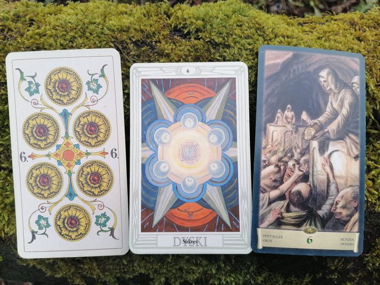 (A miłośnikom dziwacznych znaczeń kartomantycznych przekazanych przez Eudesa Picarda śpieszę donieść, że wg jego „Manuel synthétique et pratique du tarot” z 1909 r. szóstka denarów to 'hojność na przemian z chciwością, dobry lub zły użytek z pieniędzy’.)