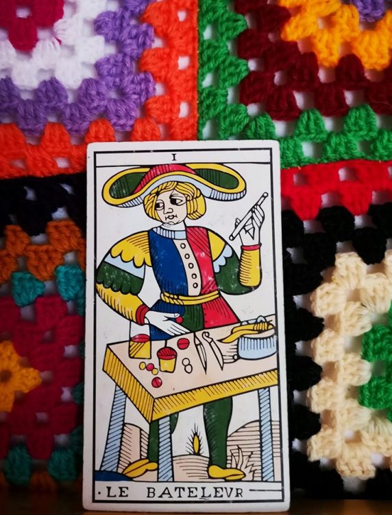 AEEU: Litera A reprezentuje kwintesencję Le Bateleura: indywiduum stojące na ziemi, szeroko rozstawione nogi zakotwiczające ciało, głowa skierowana ku niebu, splot słoneczny – reprezentowany przez poziomą kreskę w samym środku litery – mocno zakotwiczający całą strukturę. Mocna równowaga, solidny instynkt, przenikliwy umysł: to właśnie nasz magik. Litera A jest pierwszą literą naszego alfabetu, tak jak Le Bateleur jest pierwszym trumfem. Mają tę samą postawę ciała i tę samą pozycję w obrębie swoich systemów. Le Bateleur cały jest ciałem, cały jest obecnością w królestwie materii. Ale AEEU to ciekawa struktura sugerująca ewolucję, przejście od bycia otwartym na ziemię (litera A) do bycia otwartym na niebo (litera U). W samym środku ekspansywna litera E ulega podwojeniu, jak gdyby sugerując pełną powtórzeń pracę artysty, który musi ćwiczyć swoje sztuczki, aż staną się drugą naturą. Innymi słowy – dusza słowa, AEEU, zdaje się mówić: »Powtarzanie zamienia praktykę w zrozumienie«. To za sprawą najdrobniejszych rzeczy osiągamy transcendencję.