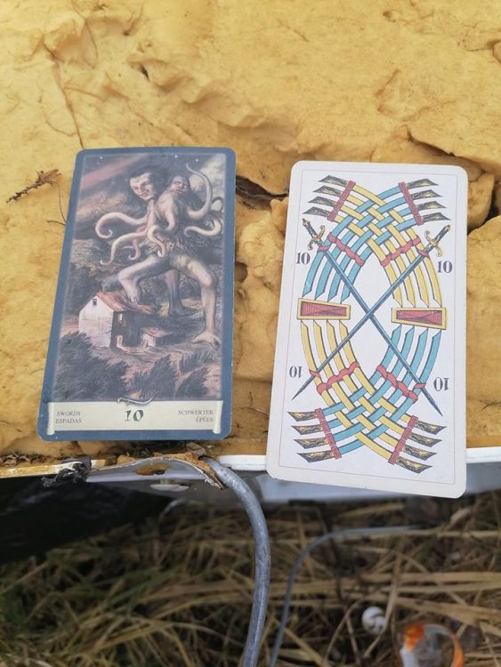 Dziesiątka mieczy – jako karta reprezentująca punkt dojścia tnącej, rozdzielającej, dyferencjującej energii mieczy – mówi o skrajnym skomplikowaniu (rozumianym jako liczba elementów) połączonym ze skrajnie małą kompleksowością (rozumianą jako liczba powiązań między tymiż elementami), zachęca zatem do spojrzenia (choćby przez chwilę, w ramach eksperymentu) na rzeczywistość jako na zbiór partykulariów nietworzących żadnej spójnej całości.