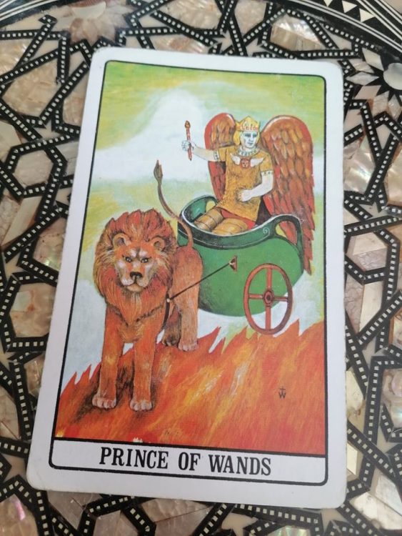 Jego magiczne tytuły to Książę Rydwanu Ognia oraz Książę i Cesarz Salamander (czyli żywiołaków ognia, manifestujących się jako jaszczuropodobne kształty jarzące się i wijące w płomieniach). Rządzi kawałkiem nieba rozciągającym się od 20º Raka do 20º Lwa, w obszarze jej panowania mieści się zatem czwórka kielichów (korespondująca z ostatnim dekanatem Raka), piątka kijów (korespondująca z pierwszym dekanatem Lwa) i szóstka kijów (korespondująca z drugim dekanatem Lwa). Druga i trzecia z wymienionych blotek dobrze oddają właściwości księcia kijów w standardowych warunkach: to odwaga, wielka energia, żądza czynu, radość życia i pewność siebie – tego wszystkiego szukajcie w sobie dzisiaj! Pierwsza z nich reprezentuje natomiast cienisty aspekt tej figury: zdarza się, że książę kijów, powodowany arogancją i dumą, zamyka się na informacje niezgodne z jego wyrobionymi, stanowczymi opiniami na jakiś temat albo odrzuca pomoc ludzi, których z tego czy innego powodu uważa za gorszych od siebie, zdarza się też, że mając ograniczone możliwości działania, książę rezygnuje i z tych opcji, które mu pozostały, i pogrąża się w marazmie i zniechęceniu – i tego postarajcie się uniknąć!