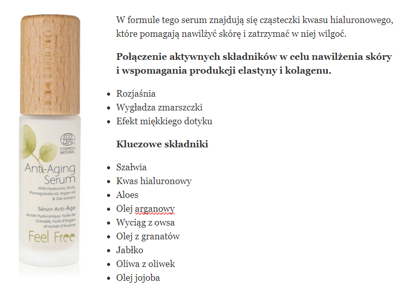 Dokupiłam to serum do kremu Feel Free na noc i na dzień oraz toniku, żeby już mieć komplet przeciwstarzeniowej naturalnej pielęgnacji, bo niby skład jest świetny, certyfikaty są, więc czemu nie spróbować starzeć się z organicznym wspomaganiem olejów i wyciągów roślinnych?