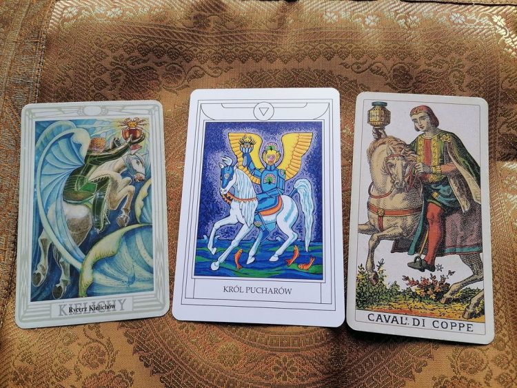 (Dla porządku dodajmy, że najstarsze znane znaczenie wróżebne rycerza kielichów, poświadczone w połowie XVIII w. przez bolońskie źródło zwane „kartomantą Pratesiego”, to „ugoda”. Paryski kartomanta Etteilla pod koniec XVIII w. podał znaczenie „przybycie”. Według „Manuel synthétique et pratique du tarot” Eudesa Picarda z 1909 r. rycerz kielichów to „uwodziciel”.)