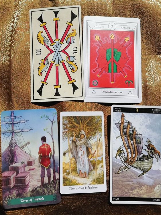Karta ta reprezentuje wpływ płodnej sefiry trzeciej, Biny (בינה), manifestujący się w ognistym świecie kijów, wskazuje zatem na entuzjastyczne i odważne rozpoczęcie nowego przedsięwzięcia, twórczy zapał, siłę puszczoną w ruch. Według nauk Hermetycznego Zakonu Złotego Brzasku korespondującym z nią dekanatem jest drugi dekanat Barana, rządzony przez Słońce (planetę wywyższoną w tym znaku), co dodatkowo sugeruje odwagę, spontaniczność, inicjatywę i impet. Również tradycyjny układ kijów na karcie jest sugestywną wizualną metaforą: do dwóch skrzyżowanych kijów – widniejących na poprzedniej karcie, czyli dwójce kijów, i przywodzących na myśl rozstaje dróg – karta ta dodaje trzeci, przebijający się przez punkt przecięcia tamtych, co obrazuje ideę nowego kierunku, porzucenia wahań i przezwyciężenia impasu. Trójka kijów to zachęta do rozbudzenia w sobie energii, wzmożenia pewności siebie i rzucenia się w wir przygody!