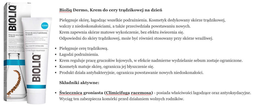 Bioliq, Dermo, Krem do cery trądzikowej na dzień (Cimcifuga racemosa) – brzmi dosyć sugestywnie, sami przyznacie. Nie ukrywam, że kupując ten krem byłam tyleż podekscytowana (och, cimcifuga racemosa, czymkolwiek jest, na pewno zadziała), co nieświadoma tego, że daję się nabić w tubkę kolejnego mazidła wyprodukowanego przez Aflofarm, który już kilka razy w życiu pokarał mnie za naiwność wysypem dorodnych niedoskonałości. jak miało być tym razem? Czy niechlubnej tradycji stało się zadość? A może odszczekałam swoje brzydkie słowa pod adresem kosmetologów z laboratorium Aflofarmu?