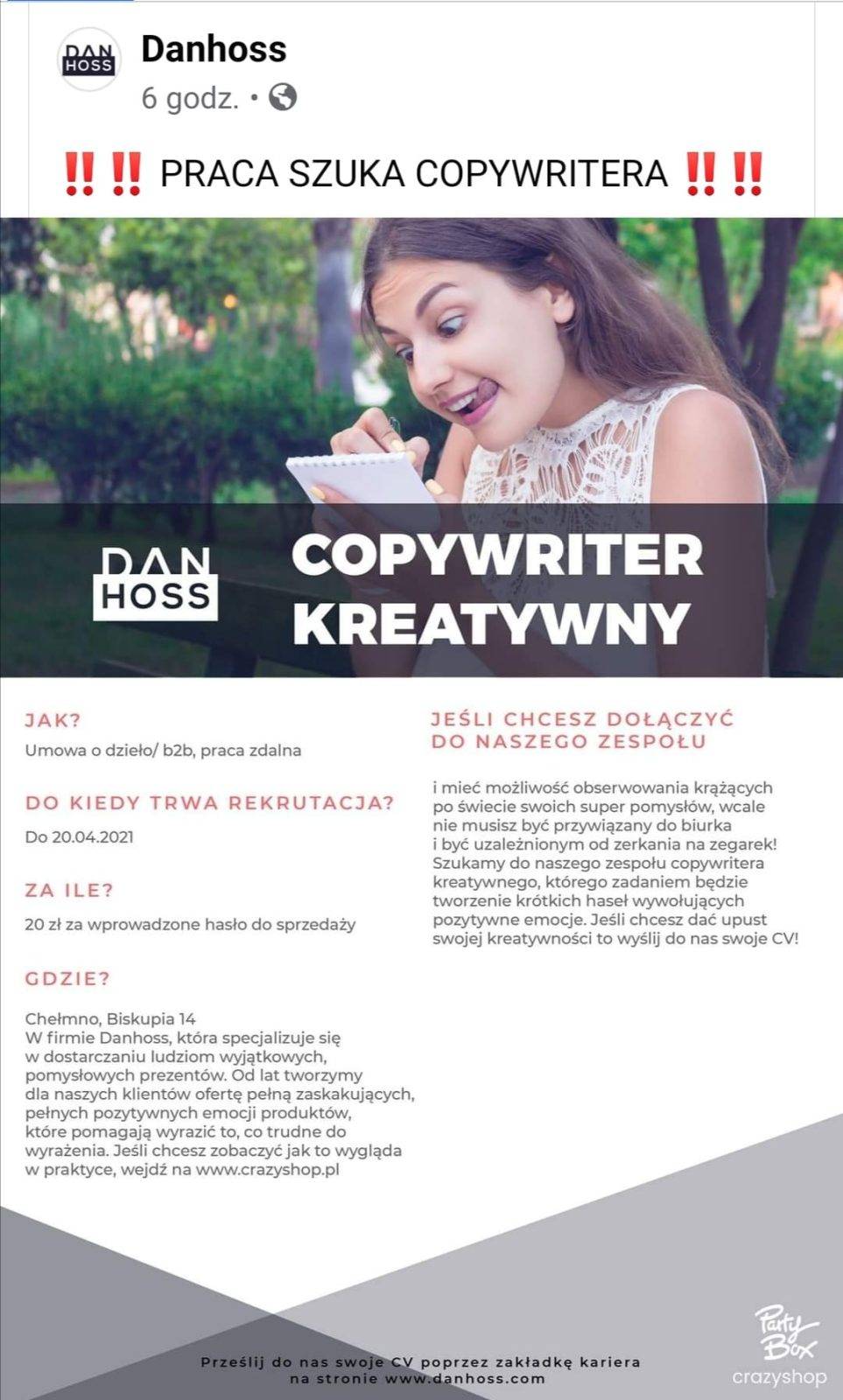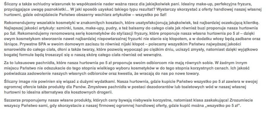 PS. W pandemii wszyscy zostali copywriterami, bo – jak powszechnie wiadomo – copywriter siedzi w domu, coś tam sobie stuka na laptopie i dostaje za to kasę. I nie chodzi o to, że to jest tekst dla hurtowni badziewia po 5 zł, bo takie koszmarki widuję wszędzie. Ten po prostu wydał mi się najbardziej uroczy.
