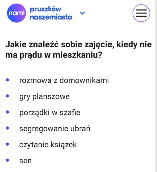 A do tego wszystkiego w Pruszkowie skończył się prąd. Szukając informacji, dlaczego, jak i po co – natrafiłam na zacną poradę, że oto mogę sobie teraz w głębokiej ciemności zacząć segregować moje czarne ubrania w ciemnej szafie