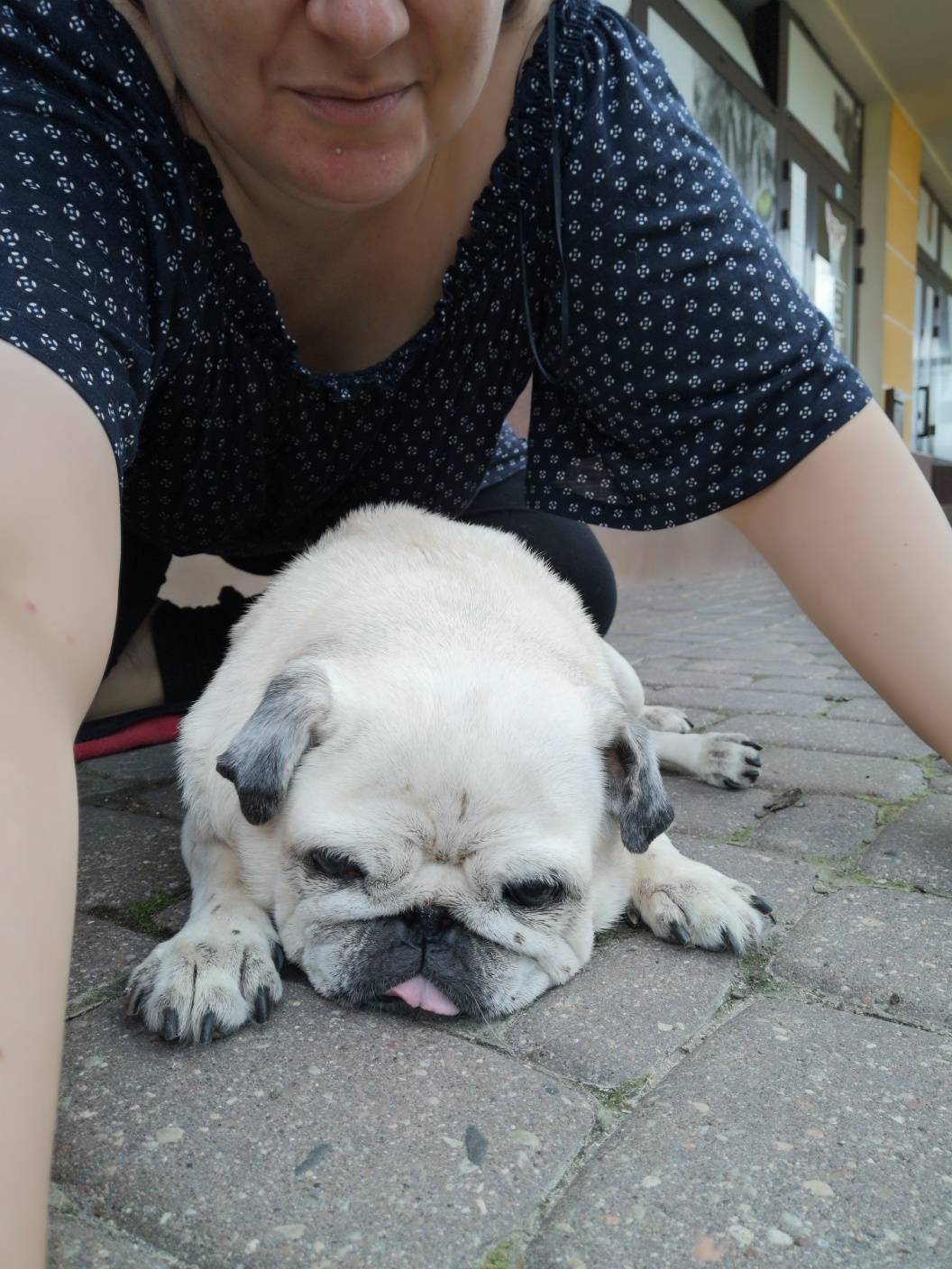 Tutaj obozujemy sobie pod lecznicą kardiologiczną – mamy kocyk, piciu, duperele i chłodzącą butelkę z zamrożoną wodą. A przyjechaliśmy godzinę wcześniej, żeby uspokoić i wyciszyć Kumoka przed badaniem.