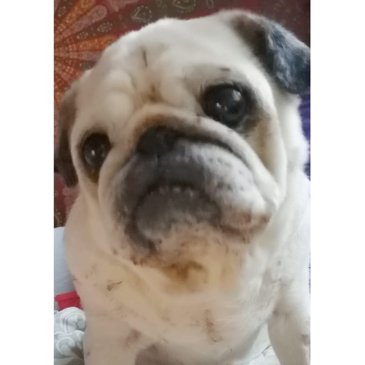 Tymczasem nic bardziej mylnego! – Ten „biedny pies” sam dopomina się o tabletki ukryte w kotlecikach z mokrej karmy i sam wskakuje na kanapę, dając mi sygnał, że czas na inhalację! I przepięknie odchyla główkę, czekając cierpliwie, aż oczyszczę i zakroplę jej oczy.