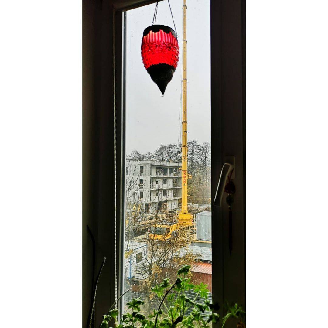 ustawiam doniczki z geranium tak, żeby zasłaniały ten cały bajzel za oknem…