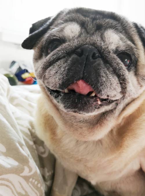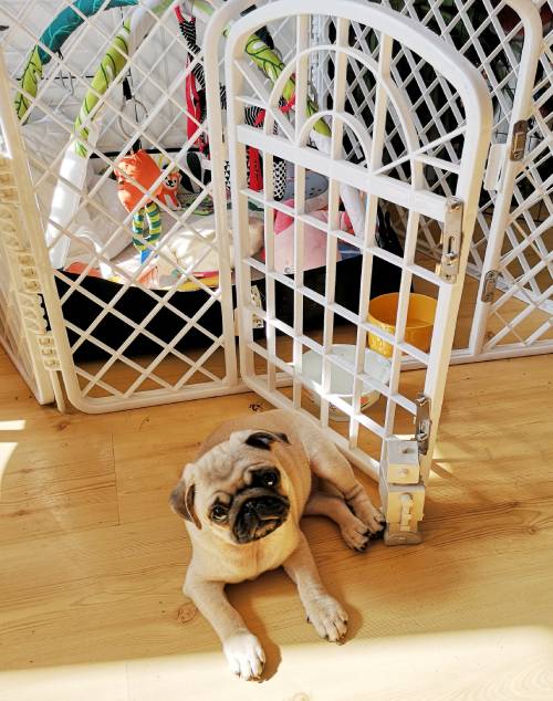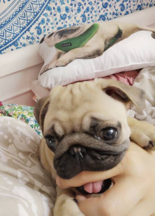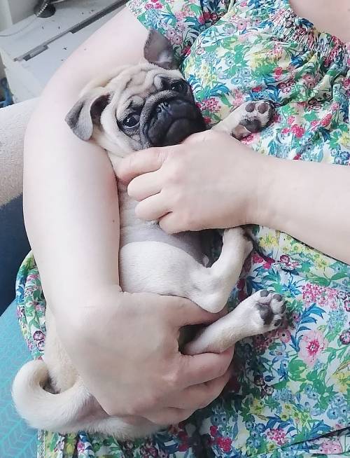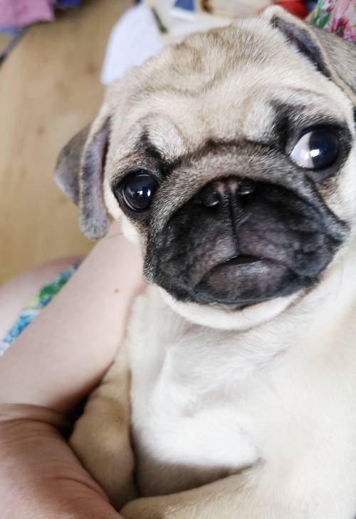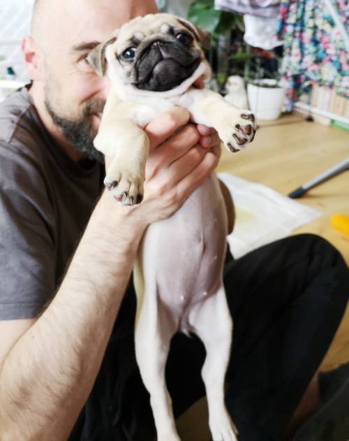 A propos spacerków: nie możemy się ich doczekać również dlatego, że niespożyta energia Czuczu potrafi manifestować się o 4 rano, kiedy mopsi kurdupelek – wiedziony jakimś dzikim impulsem – zaczyna nam skakać po głowach. Marcin jest na tyle kochany, że bierze tę szczeniaczkową furię na siebie i idzie z Czuczu do drugiego pokoju, gdzie wspólnie trenują piłkę, gumowego węża, grającego wielorybka i pluszową grzechotkę. No ale potem musi odespać ten wspaniały poranek: