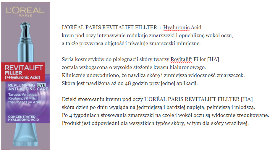 skład i opinie L’OREAL Revitalift Filler + Hyaluronic Acid Krem przeciwzmarszczkowy pod oczy z kwasem hialuronowym