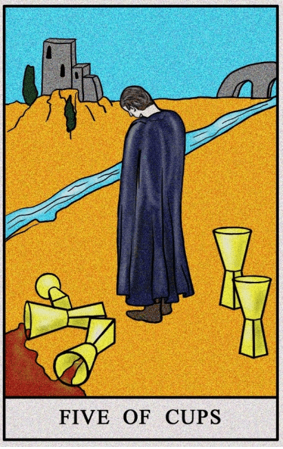 W obliczu mniej sprzyjających kart, Piątka Kielichów wskazuje na konieczność ponownego rozważenia swojego postępowania i rozliczenia się z przeszłością, aby pozbyć się iluzji. Konieczne jest przezwyciężenie uczucia bezradności i większe zaufanie bliskim, odbudowa więzi rodzinnych, a nawet przywrócenie starych przyjaźni i sympatii, a może nawet starej miłości.