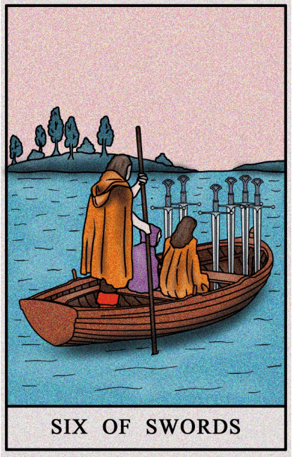 Szóstka Mieczy symbolizuje zmianę miejsca, ucieczkę oraz milczenie. Ta karta jest metaforą odcięcia się od pewnych spraw i osób. Jej obecność w rozkładzie może wskazywać na podróż, przeprowadzkę, zmianę miejsca pobytu lub nowy kierunek w życiu. Równocześnie oznacza milczenie, brak komunikacji i pozostawienie przeszłości za sobą.