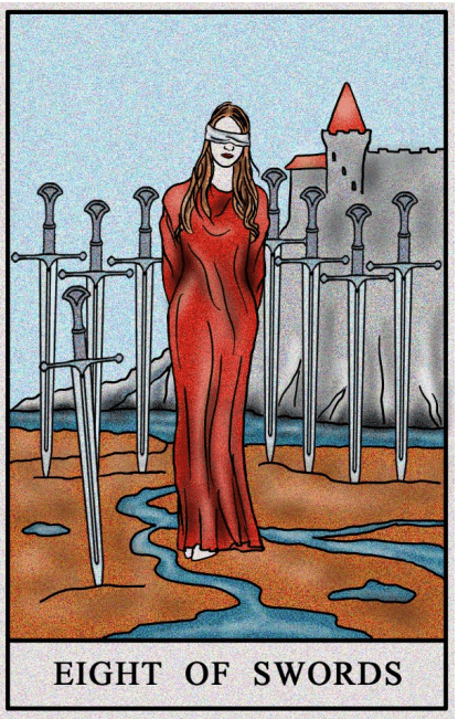 Paraliżujący lęk, poczucie winy oraz błędne koło to centralne elementy, które rysuje karta Osiem Mieczy. Karta ukazuje stan bycia uwięzionym w negatywnych myślach, pułapce ograniczeń, spętania w martwym punkcie, a także niemożności podejmowania decyzji i postępowania naprzód. Jej pojawienie się w rozkładzie sugeruje, że sytuacja nie jest bez wyjścia, ale rozwiązanie wymaga przezwyciężenia uczucia strachu i podjęcia konkretnej akcji zamiast tkwić w poczuciu beznadziei i zniechęcenia.