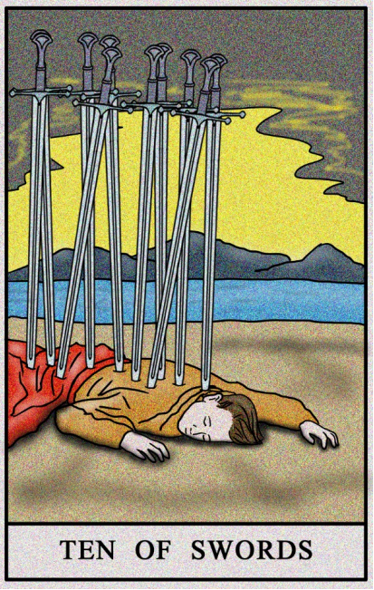 Zakończenie pełne bólu, straty i uwolnienia to główne elementy ukazane na karcie Dziesięć Mieczy. Ten obraz odzwierciedla nagłe nieszczęście, moment, gdy wydaje się, że sytuacja nie może już bardziej się pogorszyć, osiągając dno cierpienia. Jednak jednocześnie jest to szansa na rozpoczęcie wszystkiego od nowa i podjęcie kroku naprzód.