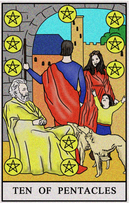 Dziesiątka Denarów przekazuje głębokie przesłanie o więziach rodzinnych, tradycji i dobrobycie. Karta ta symbolizuje dostatek, bogactwo, dziedziczenie majątku, spadek, a także obecność dużej rodziny czy dynastii. Odnosi się również do przenoszenia własności, harmonijnych stosunków między rodzicami a dziećmi, a także korzystnej realizacji planów i długoterminowych strategii.