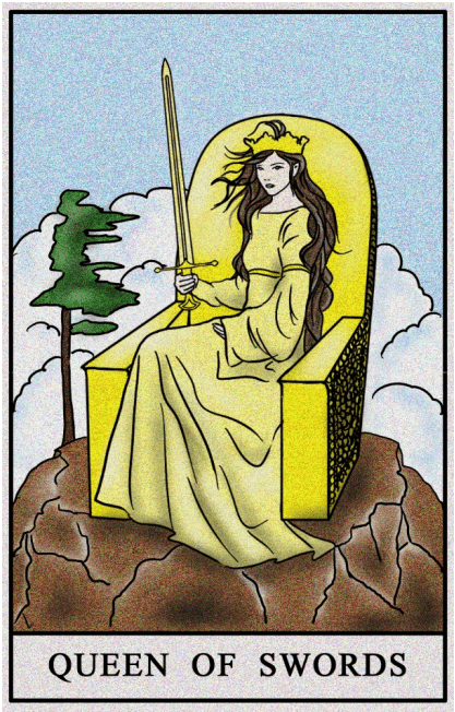 Sukces osiąga się poprzez rywalizację, ale nie wymaga brutalności; raczej wartościuje przestrzeganie zasad i pewnego wdzięku. Królowa Mieczy reprezentuje zrównoważoną, sprytną kobietę i zapowiada pojednanie konfliktujących stron lub udany finał związku. Jako dziewiąta karta talii, symbolizuje doskonałość potrójnej trójki, łącząc w sobie uczucia, duma, zakochanie w sobie, a także zdolności do dyplomacji z wyraźnym podkreśleniem własnej wyjątkowości.