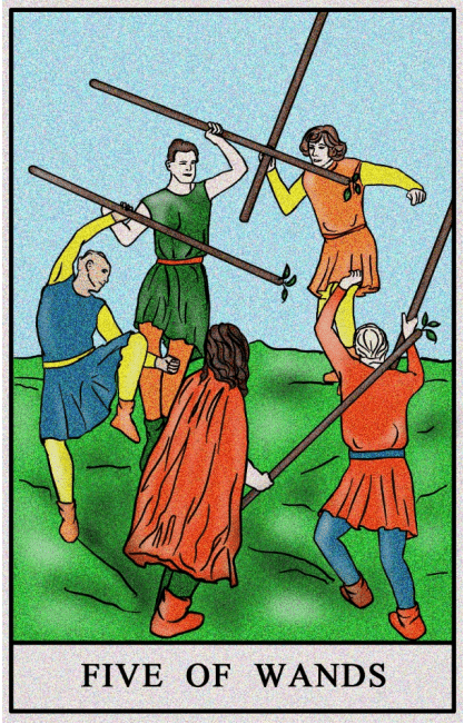 Rywalizacja, konflikt i adaptacja to kluczowe aspekty piątki buław, która może przybrać zarówno pozytywny, jak i negatywny charakter. Karta ta symbolizuje zdrową konkurencję, gdzie chęć sprawdzenia swoich sił w różnych przedsięwzięciach, rywalizacja, zawody, a także obrona swoich przekonań prowadzą do aktywnego działania. To czas, gdy poszukujemy nowych wrażeń, wyzwań i próbujemy wydobyć się z rutyny.