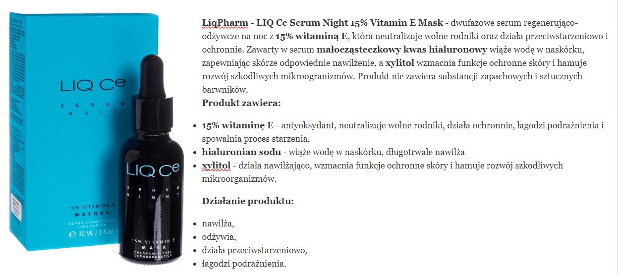 skład i opinie LIQPHARM- LIQ Ce Serum Night 15% Vitamin E Mask – Dwufazowe Serum Regenerująco-Odżywcze na Noc