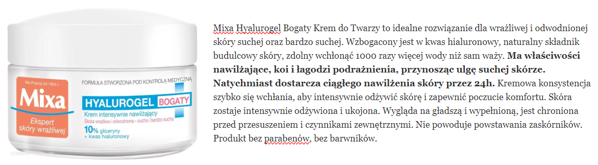 skład i opinie MIXA Hyalurogel 10% Bogaty Intensywnie nawilżający 24h na dzień i noc