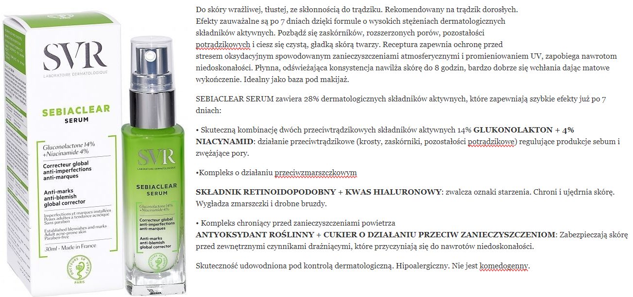 skład i opinie SVR Sebiaclear Serum Gluconolactone 14% + Niacinamide 4% (serum przeciwzmarszczkowe i przeciwtrądzikowe)