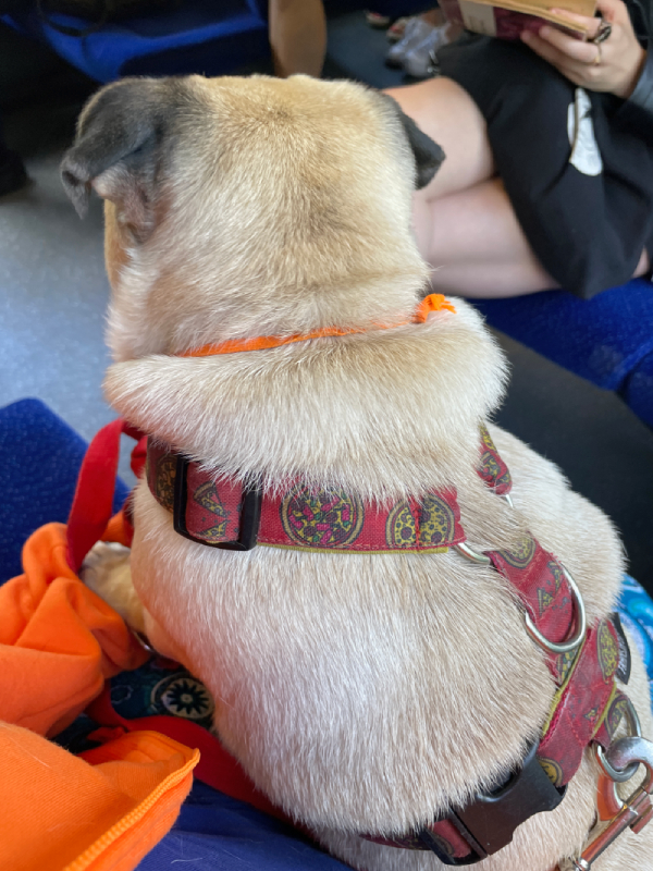 ciekawsko obserwuje współpasażerów, zaczepia i cieszy się na każdą oznakę zainteresowania ze strony ludzi
